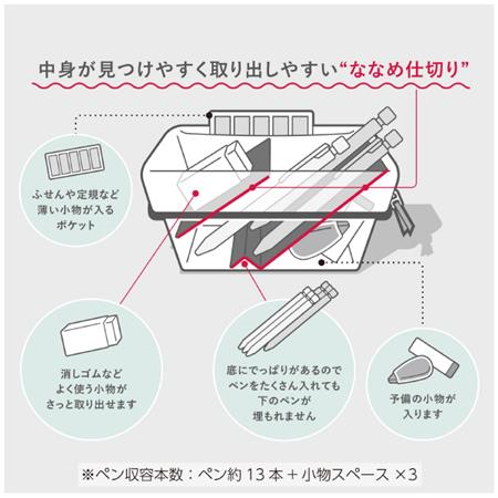 ●ななめ仕切り/ななめの仕切りがあることで、小物やペンがかさならず取り出しやすい。●ふせんや定規など薄い小物が入る内ポケット付き※縫製品ですので、上記寸法には差が出る場合がございます。ご了承ください。※ペン収容本数は目安です。ペンの種類によって前後します。●パッケージ/※縫製品ですので、上記寸法には差が出る場合がございます。ご了承ください。※ペン収容本数は目安です。ペンの種類によって前後します。ペン収容本数/約13本+小物スペース×3_●外寸法(W・D・H):210・55・120