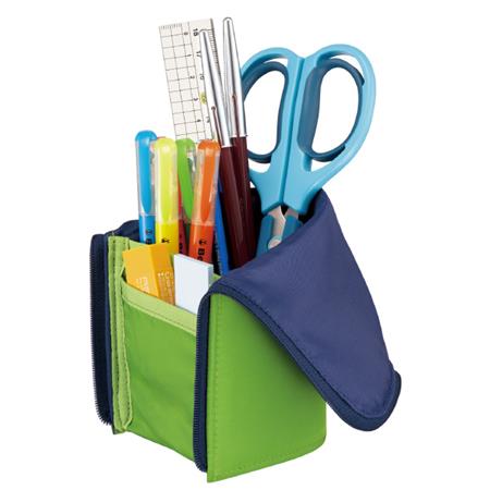 ●ファスナーを開けて上半分を折り返せば、ペンスタンドに早変わり。取り出しやすいうえに、机上の省スペースにもつながります。●両開きファスナーなので、上部を開けるだけで、中身が取り出せます。●前面の小物スペースは、消しゴムなどの分類収容に便利です。●えんぴつや18cm定規も入るラージサイズです。●ファスナー部分が持ち手になって、持ち運びにも便利です。※縫製品ですので、上記寸法には差が出る場合がございます。ご了承ください。●材質/表材・内装:ポリエステル、芯材:PP◆製品色/-1・・・ブラック×ダークグレー、-2・・・ネイビー×ライトブルー、-3・・・ダークグレー×ピンク、-4・・・グリーン×ネイビー*小物スペースはポケットにはなっておりません。収容物にご注意ください。●外寸法W・D・H:90・55・205