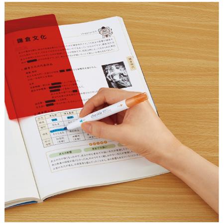 ●文字の上から塗る青色のマーカーと、文字を書き込むオレンジ色のペンが1つになった1本で2役の暗記用ペンです。どちらも赤いシートを被せれば隠れるので、効率よく暗記学習できます。●青色の暗記用ペンは、明るいブルーなのでシートで隠さない時も文字が読みやすく、普段使いのマーカーとしてもおすすめのブライトカラーです。●裏うつりしにくいインクのため、ページの裏側まで汚くなるイライラを低減します。●ノートをとる際に重要な箇所をオレンジペンで書いておけば、赤いシートで隠せるためテスト前の復習が簡単です。●暗記用ペンに赤いシートが付いたセットです。切り込みでページに固定できるので落としにくく、また本を閉じても目印になります。※青・オレンジは暗記用消しペンで消えません。●※暗記用消しペンで消えません。※オレンジ・ピンクは暗記用消しペンで消えません。●外寸法(軸径・長さ):軸径φ13×長さ142
