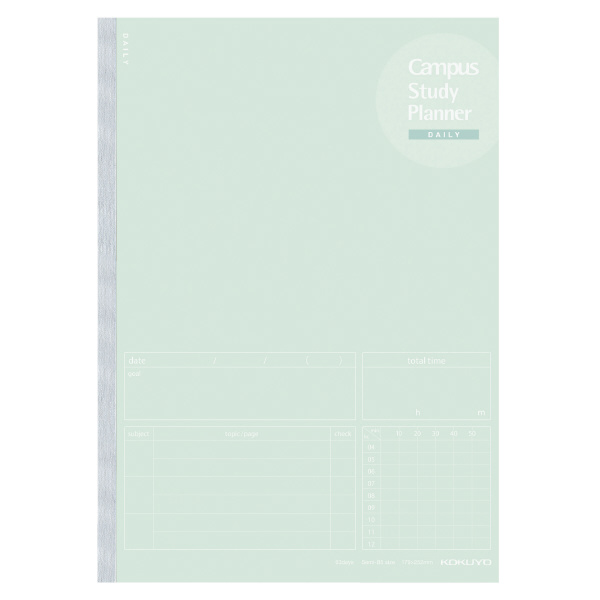●テスト前勉強や受験勉強など、勉強のスケジュールが立てられるセミB5サイズのノートです。●その日1日の勉強スケジュールをみえる化できます。●デイリー罫の特長/1.目標設定スペースで何のための勉強なのかを確認できます。2.勉強内容スペースに科目と具体的な勉強内容を記入できます。3.24時間スケジュール表で何時に何を勉強するのか色分けできます。4.チェックスペースでその日のでき具合とトータル時間を確認できます。5.メモスペースは振り返りや次の日の意気込みなど自由に記入できます。●筆記の邪魔にならない濃さのグレーの罫線です。●項目欄はグリーンの塗りつぶしです。●表紙につやのあるニス加工をすることでシンプルながらも特別感ある仕様です●中紙には森林認証紙を使用した環境対応商品です。●表2に使い方の詳細が記載されています。●中紙/上質紙●製本様式/無線とじ●枚数/32枚(扉1ページ含む)●サイズ:6号(セミB5)