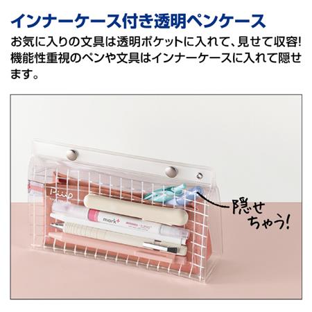●ペンも文具もまとめて収容できるツールペンケースです。●小物が埋もれにくく取り出しやすくなっています。●透明ケースには前後合わせて約15本のペンが収容可能です。●インナーケースには使用頻度の低いペン約5本と小物が4か所に分けて収容できます。●チャームなどがつけられるストラップホール付きです。※縫製品ですので、上記寸法には差が出る場合がございます。ご了承ください。※ペン収容本数は目安です。ペンの種類によって前後します。●材質/透明ケース:PVC、インナーケース:ポリエステル、芯材:PP◆製品色/-4・・・シャイニーベージュ、-5・・・セージグリーン、-6・・・ピンクテラコッタ●外寸法(W・D・H):190・55・122