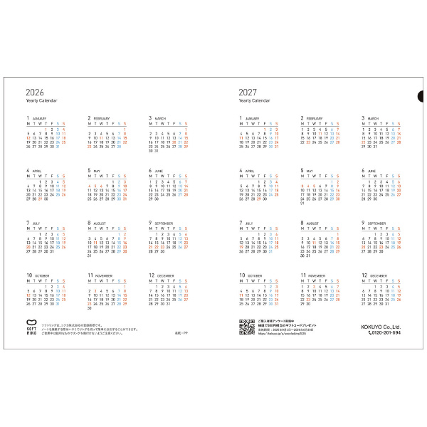 ●シンプルながらもスマートさと程よいリラックス感のある、Sooofaシリーズのマンスリーダイアリーです。●コクヨ独自開発の「やわらかリング」を採用。●平らに開くので書き込みやすい、平らに折り返せるので狭い場所でも心地よく使える、といったリングノートのよさはそのままに、書くときリングに手が当たっても気にせず端まで美しく書けます。●ノートページは自由度が高い方眼罫を採用。普通のノートに近い感覚で文字が書けます。●ノートページは自由度が高い方眼罫を採用。普通のノートに近い感覚で文字が書け、簡単な図やイラストなども描きやすいです。●ノートページが125ページついています。●罫線は4mm方眼罫で色はやさしく親しみを感じるウォームグレーです。●表紙は持ち運びに適したPP生でゴムバンド付き、上部にペンのクリップ部分を引っ掛けられる切り欠きのあるデザインになっています。●便利なPP製のポケット付き。この商品に掲載されている情報は2025年2月1日現在のものです。祝日法などの改正により、祝日・祝日名・休日あるいは行事が一部変更になることがあります。●表紙色/LG・・・ライトグリーン、LP・・・ライトピンク、LB・・・ライトブルー、DB・・・ネイビー<タイプ>マンスリー+ノート<始まり月>´25.12-´27.3 月曜始まり<編集内容>年間カレンダー・月間カレンダー(見開き両面1カ月・ブロック式)・方眼罫ノート●サイズ:B6変形