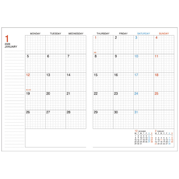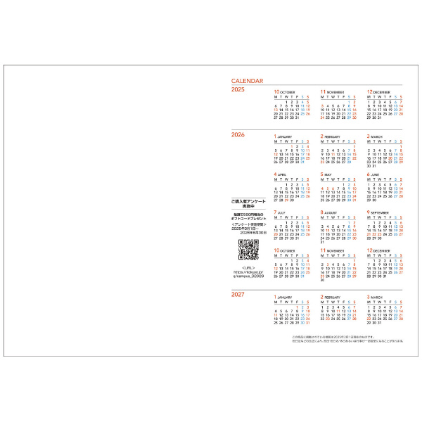 ●人気のキャンパスダイアリー・マンスリー方眼罫タイプ。●デジタルと併用でスケジュール管理をする方にもぴったりな見開き両面1カ月のブロック式。●方眼に沿って1日を分割することで、複数の予定が書き分けられます。●方眼をチェックボックスとして使用できます。この商品に掲載されている情報は2025年2月1日現在のものです。祝日法などの改正により、祝日・祝日名・休日あるいは行事が一部変更になることがあります。年間カレンダー・年度計画表・月間予定(見開き両面1カ月・ブロック式)・方眼罫・マンスリー・方眼罫_●サイズ:A5