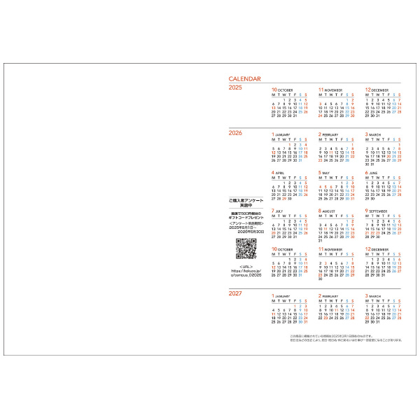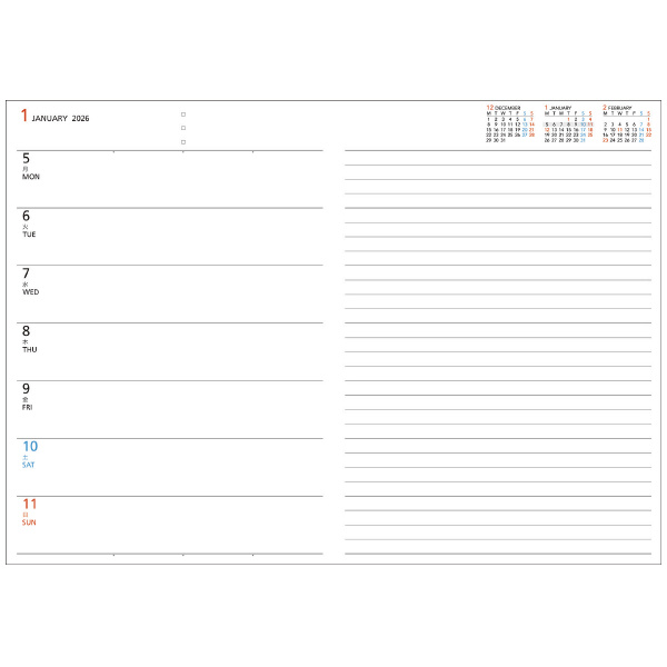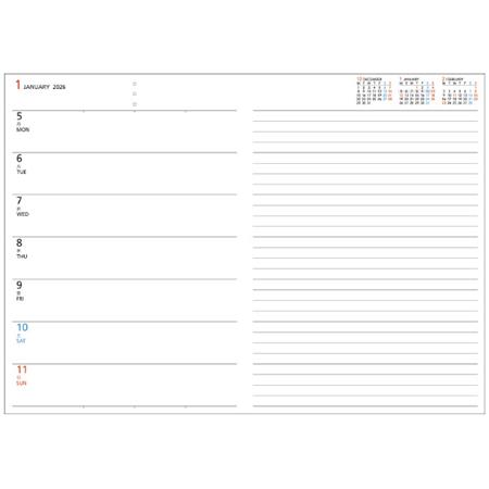 ●毎日のスケジュールが自由に書き込める見開き片面1週間+メモ。●見開きの右側ページはノートページになっているのでしっかりとメモがとれます。●ビジネスマン~学生に人気のキャンパスダイアリーシリーズ。この商品に掲載されている情報は2025年2月1日現在のものです。祝日法などの改正により、祝日・祝日名・休日あるいは行事が一部変更になることがあります。年間カレンダー・年度計画表・週間予定(見開き1週間+メモ)・横罫(28行)・ウィークリーホリゾンタルレフト_●サイズ:A5