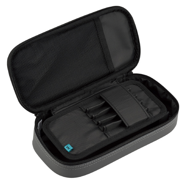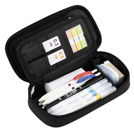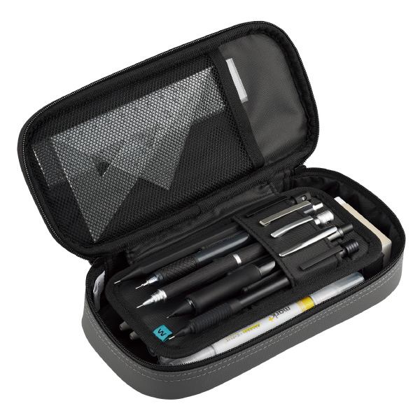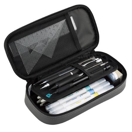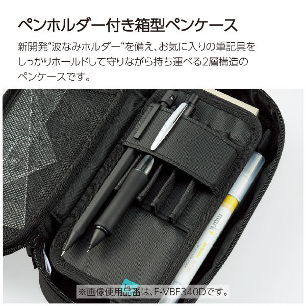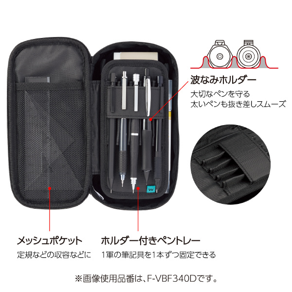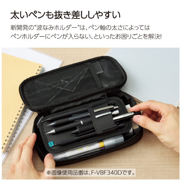 ●オリジナル設計の「波なみホルダー」は、柔軟性のある波型の仕切りが大切なペンを守り、太軸やグリップ付きのペンも抜き差ししやすい。●「波なみホルダー」はお気に入りのペンを隠す部分が少なく、また「波なみホルダー」のベース部分は下段スペースを隠してくれるため、上段のお気に入りのペンをディスプレイしたようにきれいに見せることができる。●収容するアイテムに合わせたさまざまなサイズのポケット。フタ裏には定規などが入るメッシュポケット、ペントレー裏にはシャープ替芯2個とふせんが入る薄型ポケット。下段は消しゴムや修正テープ用の小物スペースと約15本のペンが収容できる大スペースに仕切られているため、整理しやすく取り出しやすい。●丈夫なコーティング生地にクッション材を内蔵し、周囲にパイピングを施した、耐久性と高級感にこだわったデザイン。本体サイドのネームタグと、ホルダーの「ウェブレ」をアイコン化したタグがアクセント。※縫製品ですので、上記寸法には差が出る場合がございます。ご了承ください。※ペン収容本数は目安です。ペンの種類によって前後します。※ペン軸やグリップの材質によっては、抜き差しの際に擦れが発生する場合があります。※太軸のペンを多数収容すると、抜き差ししにくい場合があります。●外寸法(W・D・H):210・100・45