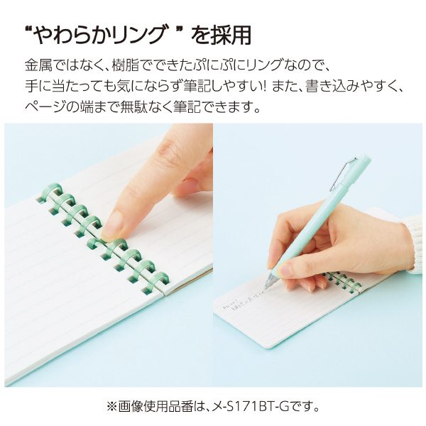 ●コクヨ独自開発の“新感覚やわらかリング”を採用したリングノートです。●折り返せるので狭い場所でも書きやすく見返しやすい、といったリングノートのよさはそのままに、書くときリングに手が当たっても気にせず端まで美しく書ける、これからの新定番ノートです。●リング形状が“Dの字型”になっているので、リング幅がコンパクトでリングノート特有のかさばり感がありません。●リングに色がついているので、色ごとに用途や教科分けした際、背で見分けることができます。●きれいに切り離せる、マイクロミシン目入りのカットオフタイプです●「美しく書く」をサポートするドット入り罫線を採用しました。●サイズ:A7
