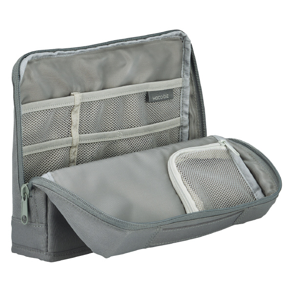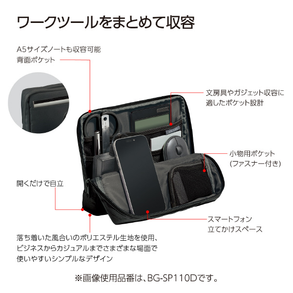 ●ファスナーを開けるだけで自立する、省スペースなワークツールポーチ。ハサミやペンなどの文具類から、マウスやACアダプタなどのガジェット類のワークツールをコンパクトに収容できる。開口部が前方に広がって自立するので、一覧性のよいデスクオーガナイザーとして使える。●従来品にあった固定ベルトをなくし、ファスナーを開くだけで簡単スピーディーに自立させることができるように構造をアップデート。●文房具やガジェットなど仕事に必要なツール一式の収容に適したポケット設計。さまざまなサイズのポケットを備え、収容するアイテムに合わせて効率よく整理できる。●外側には、落ち着いた風合いのポリエステル生地を使用しており、ビジネスからカジュアルまでさまざまな場面で使いやすい。●本製品は収容物を完全に保護する設計にはなっておりません。使用時における電子機器などの破損・故障・傷については責任を負いかねますのでご了承ください。●使用時に体質などによりお肌に異常が生じた場合は、ご使用をお控えください。※縫製品ですので、上記寸法・質量には差が出る場合がございます。ご了承ください。※内側の収納スペースの一部はポケットではなく仕切りになっております。収容物にご注意ください。●外寸法(W・D・H):235・55・185