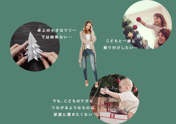 大きなツリーにオーナメントなどを飾り付けたいけれど、部屋のスペースには限りがあるし、小さな子供の場合は安全面でも心配もあって、なかなかできないというのが実情のようです。